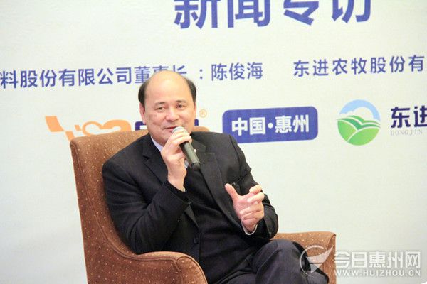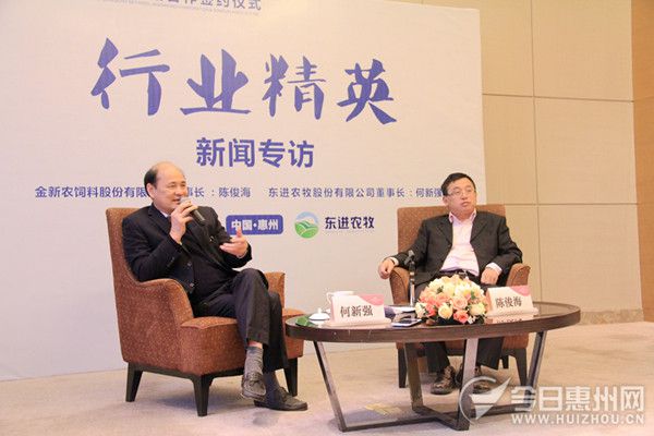 12月8日下午,东进农牧董事长何新强和金新农董事长陈俊海接受媒体记者采访。